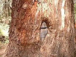 The creek is in the Toombullup State Forest, 50km from Benalla and 36km from Mansfield.[2] The area has been developed for visitors and includes picnic area, camping, toilets and walking tracks.[2] A memorial stone was put in place in 2001. It is near the remains of the hut. A tree near the site of two of the murders (Lonigan and Scanlan), the Police/ Kelly Tree, was scarped by a farmer in the 1930s. He carved the names of the three murdered police into it as a memorial. It has had a small copy of Ned Kelly's helmet attached to it. This caused great upset to the families of the murdered policemen. The other murder site (Kennedy's) is approximately 400–500 metres north west. It is across the Stringybark Creek Road.[3]