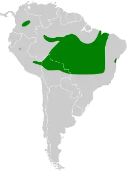 The stripe-necked tody-tyrant has a disjunct distribution. The nominate subspecies has by far the larger range. Its main population is found in central and southern Amazonian Brazil south of the Amazon from the Madeira River east to Maranhão and south to Mato Grosso, Goiás, and Minas Gerais states. That range continues west through northern Bolivia slightly into southeastern Peru's Madre de Dios Department. Small separate populations are also found in Peru's San Martín and Cuzco departments, in Colombia along the border between Meta and Guaviare departments, and in far eastern Brazil's Bahia state. Subspecies H. s. griseiceps has a very limited range along the lower Tapajos River in Brazil's western Pará state.[5][6][7][8]