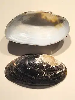 This mussel has a somewhat flattened, smooth, oval shell which is thin in young animals and becomes thicker with age. It is green, brown, or black in color with pink to orange nacre. It grows up to 10.2 centimetres (4.0 in) long.[3] The beak is ridged.[3][4]