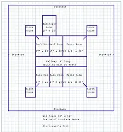 "We found that the log house in the center of the fort was approximately 60' x 60'. In comparison, the Old Slave House in Gallatin County [Illinois] is 50' x 50'. There were six rooms, three on each side, separated by a 4' hallway running east and west. The front two rooms, facing the river, measured 20 1/2' x 28'. The back four rooms were of equal size and measured 17' x 28'. There was an extension on the northwest corner of the house, 18' x 18'. Extending from the corners of the log house were four corridors approximately 100' long, evidently leading to the corner blockhouses. There was a palisade surrounding the perimeter of the house. There was also an outer perimeter palisade encompassing the entire property. From documents, we know that the house was 1 1/2 to 2 stories high."[43]