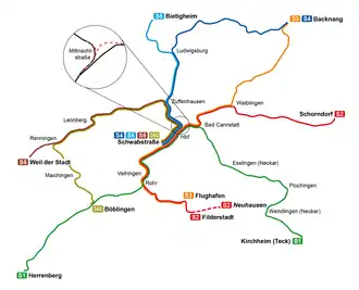 | S 1 | Kirchheim (Teck) – Wendlingen – Plochingen – Esslingen – Neckarpark – Bad Cannstatt – Hauptbahnhof – Schwabstraße – Vaihingen – Rohr – Böblingen – Herrenberg |