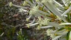 Styphelia tenuiflora, commonly known as common pinheath,[2] is a species of flowering plant in the heath family Ericaceae and is endemic to the south-west of Western Australia. It is an erect shrub with broadly egg-shaped to lance-shaped leaves and whitish-cream, tube-shaped flowers with hairy lobes.
