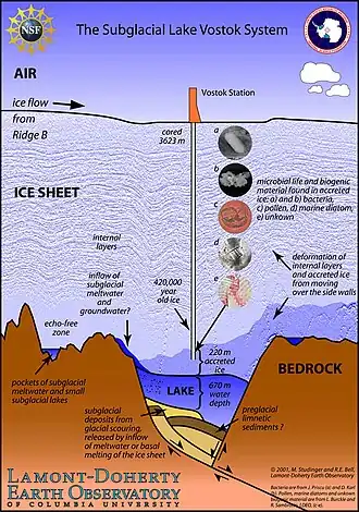 - ^ Bulat, Sergey A. (2016-01-28). "Microbiology of the subglacial Lake Vostok: first results of borehole-frozen lake water analysis and prospects for searching for lake inhabitants". Philosophical Transactions of the Royal Society A: Mathematical, Physical and Engineering Sciences. 374 (2059): 20140292. Bibcode:2016RSPTA.37440292B. doi:10.1098/rsta.2014.0292. PMID 26667905. S2CID 8399775.