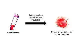 The sucrose lysis test is a diagnostic laboratory test used for diagnosing paroxysmal nocturnal hemoglobinuria (PNH), as well as for hypoplastic anemias and any hemolytic anemia with an unclear cause.[1] The test works by using sucrose, which creates a low ionic strength environment that allows complement to bind to red blood cells.[1] In individuals with PNH, some red blood cells are especially vulnerable to lysis caused by complement.[1] The test may also produce suspicious results in other hematologic conditions, including megaloblastic anemia and autoimmune hemolytic anemia.[1] False-negative results can occur when complement activity is absent in the serum.[1] A simpler alternative called the sugar water test also involves mixing blood with sugar and observing for hemolysis, using the same principle as the sucrose lysis test.[1]