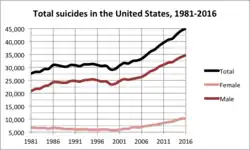 - ^ "Data Brief 241: Increase in Suicide in the United States, 1999–2014 : Data table for Figure 1. Age-adjusted suicide rates, by sex: United States, 1999–2014" (PDF). Centers for Disease Control and Prevention. Retrieved November 9, 2017.