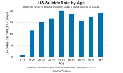 Based on the NVDRS 2016 data, The New York Times acknowledged that, among men, those over 65—who make up a smaller proportion of the population—are at greatest risk of death by suicide.[48] The NVDRS 2015 data showed that, among men of all races, men over 65 were the most likely to die of suicides (27.67 suicides per 100,000), closely followed by men 40–64 (27.10 suicides per 100,000). Men 20–39 (23.41 per 100,000) and 15–19 (13.81 per 100,000) were less likely to die of suicides.[49]