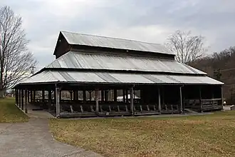 This one-story open air camp meeting shed with gable on hipped roof is rectangular, measures approximately 72 x 45 feet, and has a nave plan. The structure is supported by hewn and pegged timber truss work. It features a stage, unfinished plank pews, and a packed earth and sawdust floor. Sulphur Springs Methodist Campground was founded following the Great Revival of 1800. First meetings here may have occurred as early as 1815. In 1842 temporary brush arbors were abandoned for a more permanent structural complex. The present shed as well as the other buildings, now extinct, were reconstructed according to the same plan and shape and utilizing the same materials in 1900.[1][2]