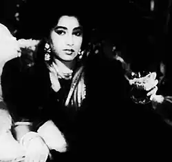 She sustained her career in Bengali cinema also with films such as Abhijog (1947), Pather Dabi (1947), Pratibad (1948), Joyjatra (1948), Swami (1949), Devi Chowdhurani (1949), Samar (1950), Dasyu Mohan (1955).[9] She has been idolized for her role as the beautiful alcoholic wife of a landlord in Kartik Chattopadhyay's cult classic Saheb Bibi Golam (1956) which is an adaptation of Bimal Mitra's classic novel of the same name.[11][12] Her portrayal of Bijali, a nautch girl with a bereaved heart in Haridas Bhattacharya’s National Award winning Bengali film Aandhare Alo (1957) acquired an overwhelmed critical response.[13][11] She also garnered acclamation for her roles in Bengali films such as Ekdin Ratre (1956), Nilachaley Mahaprabhu (1957), Joutuk (1958) and Kinu Gowalar Gali (1964).[11][6] In the late fifties, she was invited to the Asian Film Festival in China as a delegate from India.[11]