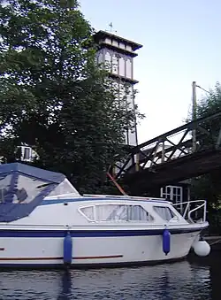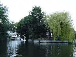 The island is linked to the eastern part of the developed riverside of Sunbury on the left, 'Middlesex', bank of the river.[1] The island is pedestrianised and residential comprising 25 houses and bungalows in typically garden or patio plots with equal or smaller footprint to those homes.[1] It is connected to a narrow point between homes on the bank by a flat iron footbridge with criss-crossed decorative railings surmounted by an ornamental Italianate square tower, pictured right.