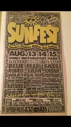 The 1993 edition of Sunfest was held from August 13 to August 15. It was the first year the festival featured a band from outside of Canada. That year's festival was headlined by Pearl Jam, and also featured Blue Rodeo, Wild T and the Spirit, 54-40, The Watchmen, The Pursuit of Happiness, Skydiggers, Sass Jordan, Streetheart, Randy Bachman, Sven Gali and Headstones. Day 2 set a record one-day attendance for the festival with 19,000 people attending the night in which Pearl Jam performed.[2]