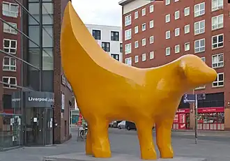 Superlambanana is a bright yellow sculpture in Liverpool, England. Weighing almost 8 tonnes (7.9 long tons) and standing at 5.2 metres (17 feet) tall, it is intended to be a cross between a banana and a lamb and was designed by New York City-based Japanese artist Taro Chiezo. It stands in Tithebarn Street, outside the Avril Robarts Library of Liverpool John Moores University. It was previously located on Wapping near the Albert Dock.[1]
