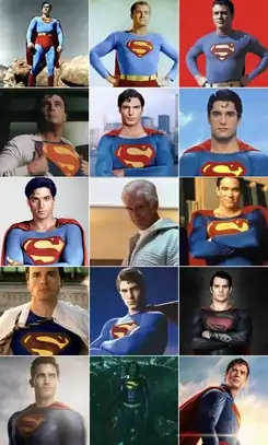 ![]() Actors who have portrayed Superman: (first row) Kirk Alyn, George Reeves, Johnny Rockwell, (second row) Bob Holiday, Christopher Reeve, John Haymes Newton, (third row) Gerard Christopher, Ron Ely, Dean Cain, (fourth row)Tom Welling, Brandon Routh, Henry Cavill (fifth row) Tyler Hoechlin, Nicolas Cage, and David Corenswet | |