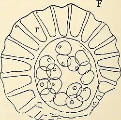 Fern sporangia consist of hygroscopic ribs that protrude from a spine on the part of the plant that encapsulate spores in a sack (diagram). A capillary bridge is formed when water condenses on to the surface of these spines. When this water evaporates, surface tension forces between each rib cause the spine to retract and rip open the sack, spilling the spores. Borno [5] and her fellow researchers fabricated a biomimetic device from polydimethylsiloxane using standard photolithography techniques. The devices used the same hygroscopic ribs and spine that resemble fern sporangia. The researchers varied the dimensions and spacing of the features of the device and were able to fine-tune and predict movements of the device as a whole in hopes of using a similar device as a microactuator that can perform functions using free energy from a humid atmosphere.