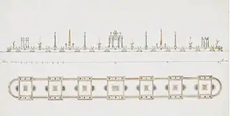 Notable examples of surtouts de table include those made the Italian goldsmith Luigi Valadier, often designed by his son, the architect Giuseppe Valadier. These monumental surtouts de table often represent Roman cities in miniature, complete with temples, colonnades and triumphal arches of coloured marbles and alabaster mounted on gold and mosaic pediments.[6]