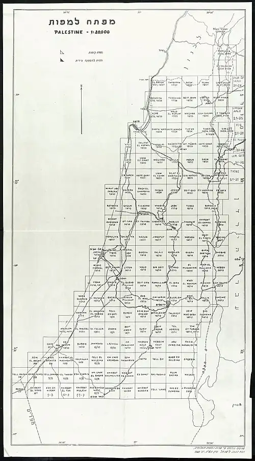 - 1:20,000 topographical-cadastral maps (see here): 45 1:20,000 sheets had been published by 1940, primarily covering the coastal area. By 1948, c.150 1:20,000 sheets had been published, covering the whole country north of Beersheba.[16]