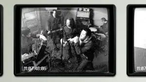 There are also cameras directed at hallways and stairs inside the apartment block. After about a minute, these screens show a SWAT team armed with submachine guns assembling outside. They enter in formation, and eventually break down a door (on which the letters "REV 18 3–4" are stenciled, a reference to a passage in the Bible) and enter the apartment where the band is playing. The noise disturbs all the residents, who momentarily stop what they are doing and move off to investigate, then return to their activities. At this point, a number of cameras have been turned off and show static. The band is no longer in their room. It has been torn asunder and a large smear of blood is visible on the floor. The final shot shows a bleeding corpse being dragged around a corner and out of sight.