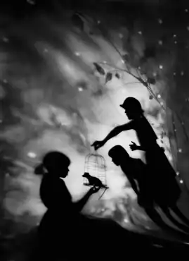 Grant's touring, multi-chapter project Night Journey (2000– ), has included an immersive installation, individually and grouped images, video projection and sound.[9][10][3][1] The series portrays a surreal, indistinct space in which silhouetted, incongruous forms (e.g., female figures, dolls, ballerinas, birdcages) seem to merge, partially vanish or melt into one another.[3][36] The orchestrated interplay of shadow gestures and props on a screen was inspired by sleep laboratory research (conducted on Grant in collaboration with Dr. John Herman at the University of Texas Southwestern Medical Center), dream recordings and descriptions, memory and journal sketches.[37][22][1] The images were first printed and displayed in mazes of sheer chiffon panels hung from ceilings, then as black-and-white iris prints; critics suggested they convey a sense of both uncanny mystery and hazy familiarity, like Plato's Allegory of the Cave—shadows standing for other realities.[10][13][22] According to Lenscratch critic Aline Smithson, the series evokes "monochromatic dream states, psychological spaces that are at once childlike and a little bit sinister. [Grant's] use of light, shadow, and silhouette reflect a process that is well-considered and methodical."[12]