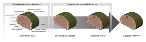 Susisuchus has a dorsal shield of osteoderms that is similar to those of the more derived clade Eusuchia, which includes living crocodilians. Susisuchus was one of the first mesoeucrocodylians to have a tetraserial paravertebral shield, which is formed from the dorsal osteoderms to make the back more rigid. In a tetraserial paravertebral shield, there are four separate rows of paravertebral osteoderms (osteoderms near the midline of the back). Earlier mesoeucrocodylians such as Bernissartia have biserial paravertebral shields, in which there are only two rows of paravertebral osteoderms. These two rows of large osteoderms became segmented into four smaller rows in Susisuchus.[3] Susisuchus also has two rows of accessory osteoderms to either side of the paravertebral osteoderms which are not part of the shield.[4]