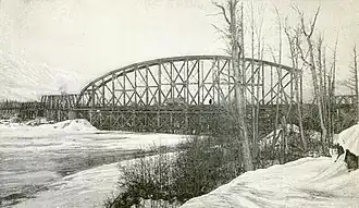 The Susitna River Bridge, also known as the Gold Creek Bridge, was the longest bridge span on the United States Government Railway in Alaska. The steel 504-foot (154 m) through-truss channel spans the Susitna River. It was completed in February, 1921. The crossing of the Susitna includes two 121-ft. combination Howe truss flanking spans and two 70-foot (21 m) combination pony Howe truss end spans, with 392 feet (119 m) of trestle at the southern approach and 28 feet (8.5 m). at the northern approach, making a total length of 1,322-foot (403 m). It is located 150 miles (240 km) north of Anchorage, and 264 miles (425 km) north of the terminus at Seward.[2] The bridge was listed on the National Register of Historic Places in 1977.[1]