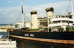After the war, Volynets was used for towing captured vessels from Germany and Poland to shipyards in Leningrad. Still flying the naval ensign, she was transferred to the auxiliary fleet on 29 April 1948 and stationed in the Western Gulf of Finland.[2] In 1951–1952, Volynets was extensively refitted at Rauma-Repola shipyard in Rauma as part of the Finnish war reparations to the Soviet Union.[3] The refit included replacing her old coal-fired boilers with new Swedish-built oil-fired boilers and almost complete rebuilding of her superstructure.[2]