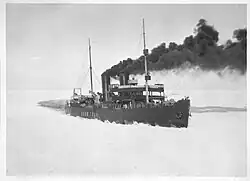 Although Wäinämöinen was an invaluable addition to the Finnish icebreaker fleet, she was not used as extensively as the smaller state-owned icebreakers due to her high fuel consumption and the shortage of coal shortly after the war. In addition to icebreaker duties she was used to transport volunteers across the Gulf of Finland to participate in the Estonian War of Independence.[6] In September 1919 she was drydocked in Suomenlinna, but while the repair work was completed in late October, she could not leave the shipyard until 24 November due to her deep draft and the particularly low sea level.[7] During the particularly harsh winter of 1922 she assisted 170 ships to and from the Finnish ports. Her last task under the Finnish flag was to open the South Harbour in Helsinki on 16 April 1922.[8]