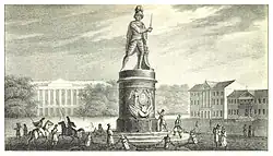 The monument was initially to be placed in Gatchina, until Emperor Paul designated a new site so as to be close to his new residence at the Mikhailovsky Castle.[1][2][3] The monument was originally located in the southern part of the Tsaritsyn Meadows, now the Field of Mars, close to the Moyka River. In 1818 the area around the Mikhailovsky Castle was redeveloped by architect Carlo Rossi, who suggested moving the monument to a newly created square facing the River Neva.[1] Emperor Alexander I approved the suggestion, and the square became known as Suvorov Square.[1][2] At some point between 1801 and 1818 a chain fence supported by cannon balls was erected around the monument.[2][4] In 1834 the original marble pedestal was found to be suffering from cracking, and was replaced with a pink granite pedestal of the same design between 1836 and 1838.[1][2][3]