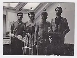 While working at the studio Pitra did not shun drawing based on a model, but he very quickly found his own style, at first relying on a ruler and French curve, with which he constructed pronounced figures formed with a strong line and sharp contrasts of black and white areas. He was just as masterful in handling lettering, which he placed in his drawings in the form of various signs and labels. Pitra admired the drawings of František Bidlo and above all the portrait shorthand of his professor Adolf Hoffmeister, for whom the medium was a "mask that is truer than the face".[3] Pitra also understood drawing as a record of his internal life that was to be rendered with as economical means of expression as possible.
