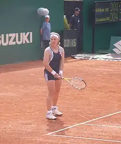 She made her first final of the year at the J&S Cup in Warsaw, defeating former world No. 1 Clijsters in the semifinals. In the final, Kuznetsova lost to Henin.[39] At the French Open, Kuznetsova lost again to eventual champion Henin in a tightly contested fourth round match, having wasted a match point in the third set.[40] At Wimbledon, Kuznetsova reached the quarterfinals for the second time before losing to top seed Davenport. She teamed up with Mauresmo to reach her sixth Grand Slam doubles final but suffered a heavy defeat by Cara Black and Liezel Huber.[41]