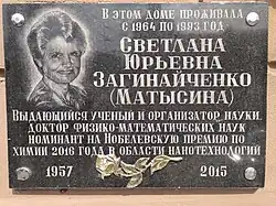 Svetlana Yurievna Zaginaichenko (Ukrainian: Світлана Юріївна Загінайченко, Russian: Светлана Юрьевна Загинайченко; 10 August 1957 - 23 November 2015) was a Ukrainian solid state physicist. She studied the physical properties of carbon materials and their application to hydrogen energy storage. She was a nominee for the 2016 Nobel Prize in Chemistry for her work in studying fullerenes.[1]