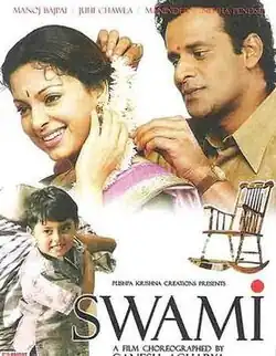 Swami is a 2007 Indian Hindi drama film, directed and choreographed by Ganesh Acharya with screenplay by Bhavani Iyer and Muazzam Beg. The main cast consists of Juhi Chawla and Manoj Bajpai. In a first of its kind attempt, the background music score of Swami was recorded before shooting the film. The music of this film is by Nitz 'N' Sony. They are the first musicians to have recorded a Folk Ganpati Mandal (The Best in Maharashtra), live in 5.1 channels, overnight in an open-air makeshift studio, constructed specifically in Film City Mumbai for the movie. This is the only 5.1 recording of a Folk Ganpati Mandal ever done. The film was released to negative reviews.