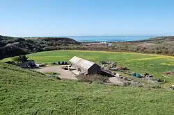 Swanton Pacific Ranch sits in the coastal mountains north of Santa Cruz. The 3,200-acre (1,300 ha) spread include 2,100 acres (850 ha) of forest extending from steep mountain slopes down to grassy meadows. Scott Creek runs through Swanton Ranch. "The landscape is different here than on campus," notes natural resource management Professor Brian Dietterick, a certified hydrologist and the ranch's director. "First are coastal forested mountains- steep mountains that support perennially flowing streams. The streams serve as habitat for sensitive aquatic species and fish like Coho salmon and Steelhead trout." Swanton Pacific is a unique place to teach resource management. "It's similar to a Northern California Forest," he states. Swanton Pacific is a living forest laboratory unlike any other at Cal Poly's 1,300-acre (530 ha) campus core or the 4,600 acres (1,900 ha) of university ranches just west of the campus.[3] Swanton Ranch overlooks the Pacific Ocean. It lies fifteen miles (24 km) north of Santa Cruz. The elevation ranges from sea level to around 1,200 feet (370 m) on the highest ridge north of Little Creek. There are four ecological regions on the land: cropland, forest, rangeland and riparian land. Riparian lands are adjacent to water sources. There are riparian corridors along Scotts Creek, Mill Creek, Little Creek, Archibald Creek, Queseria Creek, and some smaller unnamed drainages. The riparian corridors provide a habitat for both the endangered Central California Coast evolutionary significant unit of coho salmon and the threatened Central California Coast distinct population segment of steelhead.[4]