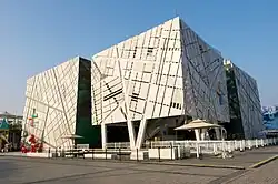 The design of the pavilion was submitted by the Swedish architectural firm Sweco, under the supervision of chief architects Johannes Tüll and Christer Stenmark.[6] It was a three-storey construction made up of four separate cube-like structures connected by elevated walkways. The first and second floors house the public exhibition, while the entire third floor was dedicated to conference areas and related facilities. A small café and a souvenir shop were located on the first floor. One of the most distinguishing design features was the laminated-wood outdoor atrium of the entrance hall, along with the roof-top glass-floor bar situated on top of it. The outside design combines an outer steel shell representing the street network of Stockholm with large panorama photography of Swedish forests on the inward-facing outer wall surfaces. This design was grounded in the concept of a meeting between city, nature and mankind.[7]