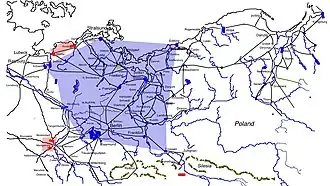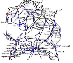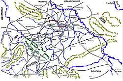 As a result of this manoeuvre Tilly was placed in a difficult position. He wanted to go straight ahead towards Mecklenburg, but if he left only the reserve he had in the Landsberg country (8,000 men),[73] then he feared that Horn would push these reserves out of Landsberg and establish the Swedes on the Warta river. Inversely, if he stayed here to protect the Warta line (which if opened would give the Swedes free access into the hereditary lands of the Austrian emperors), then the Swedish would have an easy time of marching into Mecklenburg over the Havel and relieving the siege at Magdeburg.[73] Tilly deemed it important to take Magdeburg, as taking it would be an impressive moral victory over the Swedes and, he thought, it would keep the Protestant powers of Germany cowed.[75] Additionally, Maximilian I, Duke of Bavaria was pressuring him from Dresden to strike a decisive blow by taking this city. Strategically, he wanted to ensure that Demmin wasn't taken. Since the Swedes had all the towns that were on the most direct route between Frankfurt and Demmin, he made a circuit to the south.[75] This allowed him to simultaneously move towards his objective and at the same time ensure the siege of Magdeburg continued by quickly gaining a secure footing on the Havel from which he could prevent the Swedes from relieving Magdeburg.[73] However, in addition to making this indirect route, he had to march through the Electorate of Brandenburg as tenderly as possible. As Brandenburg had not declared for either side, it still retained a neutrality, but only in the technical sense. Enough so that Tilly could demand to march through the Electors territory, but sought to alleviate the worst of the enmity this might arouse in the elector by avoiding his capital, Berlin.[75] After making this "tender" march, he finally arrived in Neuruppin.[75] As the Havel was behind him, he had achieved one of his objectives, that of keeping Magdeburg safe. However, from this position he now marched north in order to help relieve Demmin.
