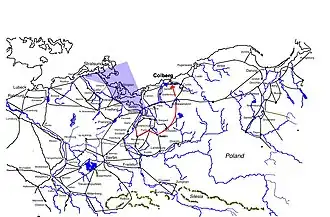 Meanwhile, stationed at Pasua and Elbing (to the far east), Oxenstierna was seeking to move towards the king. The cities that were critical to establishing a land route between the two armies was Kolberg (occupied by the Imperials) and Cammin. Knyphausen and Oxenstierna were entrusted with the task of establishing a land route between Prussia and Swedish occupied Pomerania.[61] Meanwhile, being August as it was, the king was contemplating the establishment of winter quarters.[61] However, the Administrator of Magdeburg, Christian William declared in favor of the Swedish, drove out the Imperial garrison and called the Swedes to aid the city. This was done without the king's prior knowledge, and there were many objects which the king deemed to be of higher importance than the city of Magdeburg. It is not likely the king would have encouraged such a move if he had been consulted about it. The king still wanted to march to the Elbe,[61] take possession of the duchy of Mecklenburg and engage in negotiations with Hamburg and Lübeck. Magdeburg was much too far away, and there were large contingents of Imperial troops between the Swedish army and Magdeburg. However, the king sent a colonel, Dietrich von Falkenberg, to the city and ordered him to bring the city into the highest level of defense for an anticipated siege by the Imperials.[62]