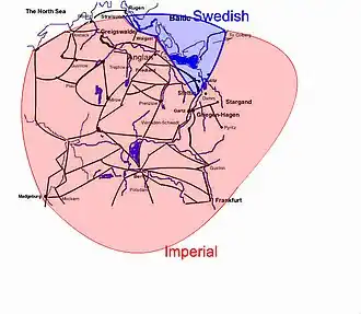 Ueckermünde and Barth (to the west of Stralsund) were also taken without incident.[58] Wolgast was besieged, and although the garrison gave up the city to the Swedes they held out in the citadel of the city.[58] This garrison hung onto the citadel until 16 August.[58] Treptow[57] was also taken.