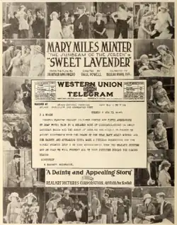 - ^ "Reviews: Mary Miles Minter in Sweet Lavender". Exhibitors Herald. 11 (12). Chicago: Exhibitors Herald Co.: [4] September 18, 1920.