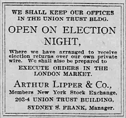 Frank served as team president of the Baltimore Orioles of the American League in 1901, their inaugural season.[1] John Mahon was elected to succeed Frank as chairman at the annual stockholders' meeting in February 1902.[2] Outside of baseball, Frank managed the brokerage firm of Arthur Lipper & Company, and his business obligations were cited as the reason that he did not continue as president of the Orioles.[2][3]