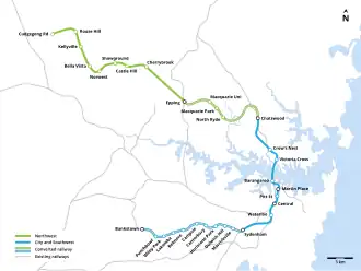 Sydney Metro Northwest was a rapid transit project that constructed the first section of the Metro North West & Bankstown Line through the north-western suburbs of Sydney, New South Wales, Australia. The project included the conversion of the existing Epping to Chatswood rail link to metro standards and connects the suburbs of Rouse Hill and Chatswood via Castle Hill and Epping. The project was managed by Transport for NSW. The line is part of the Sydney Metro system. The completed Metro North West line opened on 26 May 2019, and was later extended to Sydenham via the CBD, which opened on 19 August 2024.[9][10]