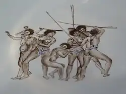 The Aboriginal group forms the inner centre piece in the tondo of both bowls. As the same image was used for both bowls, the implication is that the Chinese ceramic painters were copying from the same drawing and finishing them at the same place and time. The image is of a group of four Aboriginal men with club, shield and spears, one woman with a baby on her shoulders – standing and turned slightly away from the rest of the figures – and another woman cowed by the men. This is thought to depict a preliminary marriage ceremony.[75] As with the Museum bowl's Sydney Cove image, no directly related, surviving, version is known that would have been used by the ceramic artists to paint the Aboriginal group. The closest match is a drawing after an apparently now-lost original sketch by Nicolas-Martin Petit,[76] artist on the 1800–1803 French expedition to Australia led by Nicolas Baudin.[24] Research made around 2009–2012,[77] indicated that during Baudin's expedition, a report was prepared for Emperor Napoleon on the feasibility of capturing the British colony at Sydney Cove.[78] As this expedition progressed around coastal Australia, Petit began to specialise in the drawing of portraits of indigenous peoples.[76] The French expedition arrived at Port Jackson on 25 April 1802.[79] Petit's drawing was copied for publication as plate 114 in the Voyage autour du monde : entrepris par ordre du roi (Paris, 1825) ,[80] regarding a voyage around the world (1817–1820) led by Louis-Claude de Saulces de Freycinet.[24] The engraving is entitled Port Jackson, Nlle Hollande. Ceremonie preliminaire d'un mariage, chez les sauvages[81] (ceremony before a marriage among the natives, Port Jackson, New Holland). Port Jackson aborigines are from the Eora group of indigenous people living in the Sydney Basin.[82]