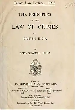 Authority selected Huda as a fellow of Calcutta University in 1902. He delivered the historical Tagore Law Lecture published in a book named The Principles of the Law of Crimes in British India by Butterworth & Co,(India) Ltd.[6] Jeremy Bentham, William Austin, and William Blackstone influenced him. He presided Muhammadan Educational Conference at Rajshahi in 1904, the East Bengal and Assam Legislative Assembly member in 1908, the All India Muslim League President in 1910, and Imperial Legislative Council between 1911 and 1915.