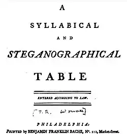 Syllabical and Steganographical Table (French: Tableau syllabique et stéganographique) is an eighteenth-century cryptographical work by P. R. Wouves. Published by Benjamin Franklin Bache in 1797, it provided a method for representing pairs of letters by numbers. It may have been the first chart for cryptographic purposes to have been printed in the United States.[1][2]
