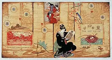 Walters's later printmaking explores personal narratives involving rites of passage, loss, ritual, aging and healing, and animal and environmental issues.[50][51] It often incorporates multiple images and motifs from nature, culture, family albums and art historical sources, such as Chinese pottery (e.g., La Grande Cascade, 1983) or Japanese prints.[52][53][50][51] She frequently subdivides picture planes into sections with specific patterns or colors, overlaid with expressively drawn elements suggesting snapshots and memories (e.g., Fathers and Sons, 1997).[3][54] Becky's Babies (2004) tells a metaphorical story using narrative panels inspired by family anecdotes and Hebrew illuminated manuscripts; Dearest Daughter (Lost Lessons) (2014) appears to depict a diary page and letter fragment along with woodcut images of animals, Hokusai's "Wave" and a father and daughter.[51][50] In other works, (e.g., Women's Work Is Never Done, 2008; The Road Is Closed, 2009; She Alights on Her Roost, 2020), Walters uses personal symbols to offer decorative and ironic takes on the uneasy relationships between humanity and work, nature, or imagery.[55][56][3]