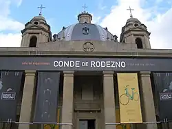 Popularly known as the Monument to the Fallen, the actual name of this monument is Navarra a sus Muertos en la Cruzada (Navarre to its Dead in the Crusade), as indicated on its facade. The building was erected in memory of the dead from Navarre, a Nationalist stronghold during the Civil War, and is located in the heart of the city of Pamplona, the capital of Navarre. The building was designed by the architects Victor Eusa and José Yamoz. The names of the 5,000 people of Navarre who died in combat in the civil war were inscribed on its walls, but today they are covered by a sheet.[66] Today the building is known as the Sala de Exposiciones Conde Rodezno (Conde Rodezno Exhibition Hall) and is used for small municipal exhibitions.[67]