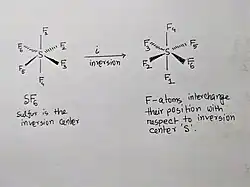 Inversion operation is shown here with a sulfur hexafluoride molecule. All of the fluorine atoms change their position to opposite side with respect to the sulfur center