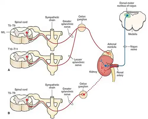 The sympathoadrenal system is a physiological connection between the sympathetic nervous system and the adrenal medulla and is crucial in an organism's physiological response to outside stimuli.[1] When the body receives sensory information, the sympathetic nervous system sends a signal to preganglionic nerve fibers, which activate the adrenal medulla through acetylcholine. Once activated, norepinephrine and epinephrine are released directly into the blood by adrenomedullary cells where they act as the bodily mechanism for "fight-or-flight" responses. Because of this, the sympathoadrenal system plays a large role in maintaining glucose levels, sodium levels, blood pressure, and various other metabolic pathways that couple with bodily responses to the environment.[1] During numerous diseased states, such as hypoglycemia or even stress, the body's metabolic processes are skewed. The sympathoadrenal system works to return the body to homeostasis through the activation or inactivation of the adrenal gland. However, more severe disorders of the sympathoadrenal system such as pheochromocytoma (a tumor on the adrenal medulla) can affect the body's ability to maintain a homeostatic state. In these cases, curative agents such as adrenergic agonists and antagonists are used to modify epinephrine and norepinephrine levels released by the adrenal medulla.[2]
