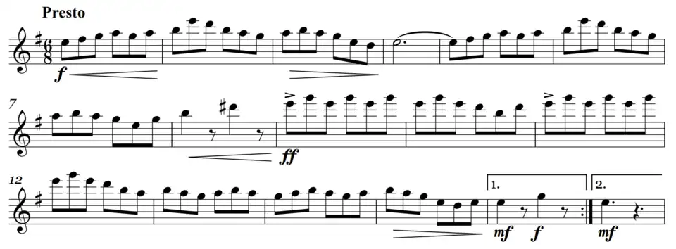The stormy main theme of the final movement is in E minor and uses the whole orchestra. The movement is written in a loose rondo form, with repetitions of the main theme broken up by calmer passages with reduced orchestration and texture.[14] The movement builds to a frantic prestissimo coda which brings the work to a dramatic close.