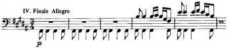 According to Oldani the finale is in sonata form, but more free than the first movement.[7] However, Brown points out that there are at least three viable ways to interpret the formal structure of this movement:[22] 1) in the standard western tradition of the symphony with the movement being either in sonata or rondo form; 2) as a collection of dances that mimic sonata form; 3) as a programmatic piece that follows the events laid out by Stasov.[23] This section begins with a pentatonic theme in the violin and viola, with the development consisting of a whole-tone passage which is also used in both Mlada and the prologue of Prince Igor.[7]