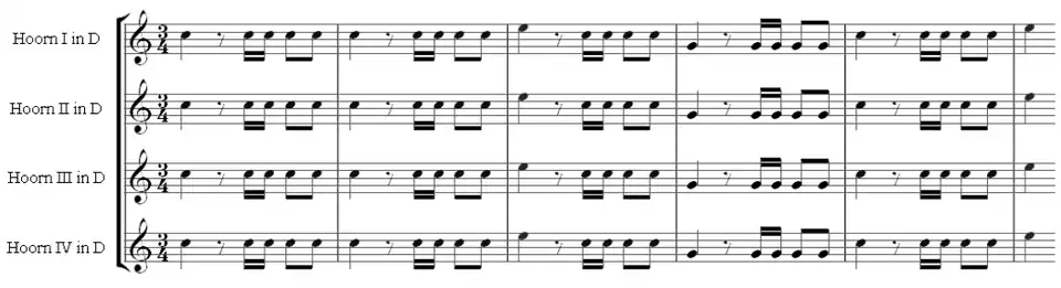 It is the first movement that shows off the horn section most dramatically, although not with the hunting calls he would later be known for in The Seasons or his Symphony No. 73, La chasse.[11] Here, Haydn begins with a military fanfare including all four horns:[12]