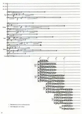 At the beginning of the illustrated page from the score, for instance, the woodwinds and brass (notated at the top of the page) are playing short repeated passages. The composer specifies completely the music for each player, leaving the interpretation to the individuals: only the co-ordination between the parts is unspecified. The strings (notated at the bottom of the page) join the texture by sections: first the violins, then the violas, the cellos and lastly the basses, all playing rapid repeating figures. The string players do not coordinate their playing (even within sections) except for their entries. These entries are indicated by the conductor, as instructed by the down-arrows above the string parts.