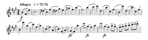 The first movement begins with violas softly oscillating between the C and A notes; after four bars of the single, minimally-inflected line, a pair of bassoons enters with the initial theme.[14] The beginning has been described by Nielsen scholar Robert Simpson as like being "in outer space"; the subsequent wave-like line "appears from nowhere, as if one were suddenly made aware of time as a dimension".[15] The very first theme ends at b. 20 with a descending scale, followed by a fortissimo interruption from violas and a subsequent horn and flute dialogue.[16] The prominent feature of instrumental pairing does not lead to any permanent thematic or textural stability, but contrarily grows into a persistent textural sparseness.[17]